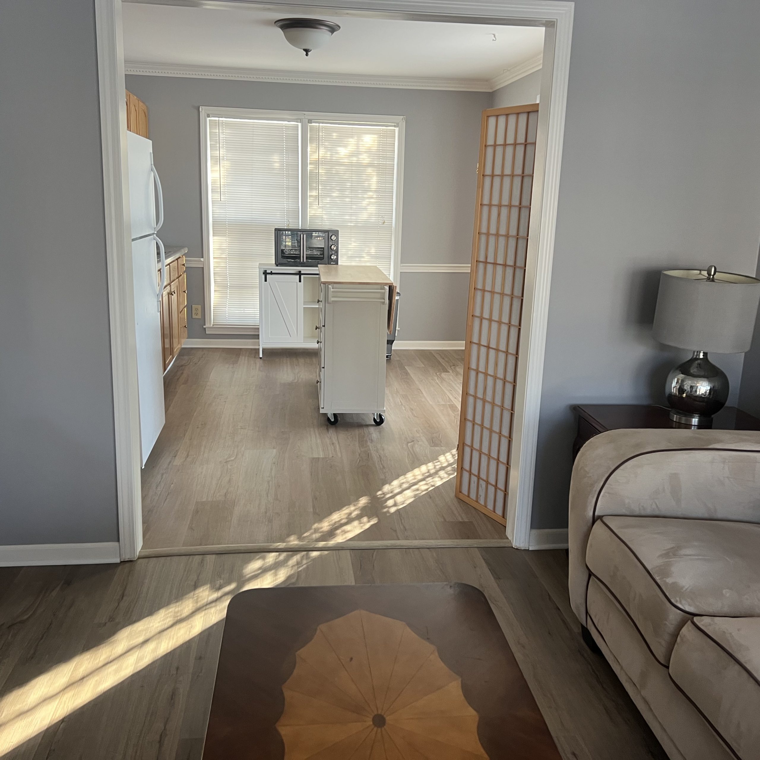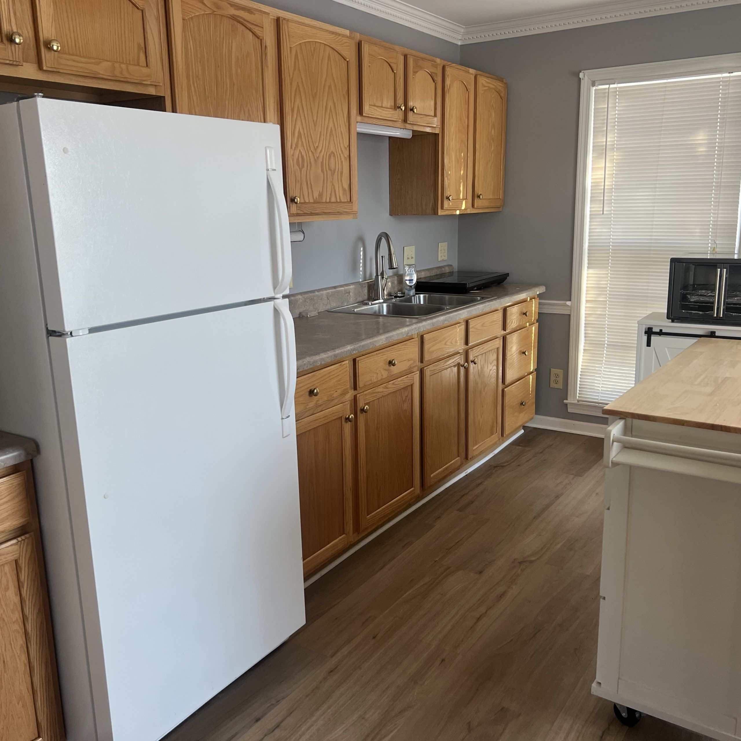 Living Room, Kitchen with countertop large Oven/ Airfryer, double plate Nuwave burner, Refrigerator, W/D.