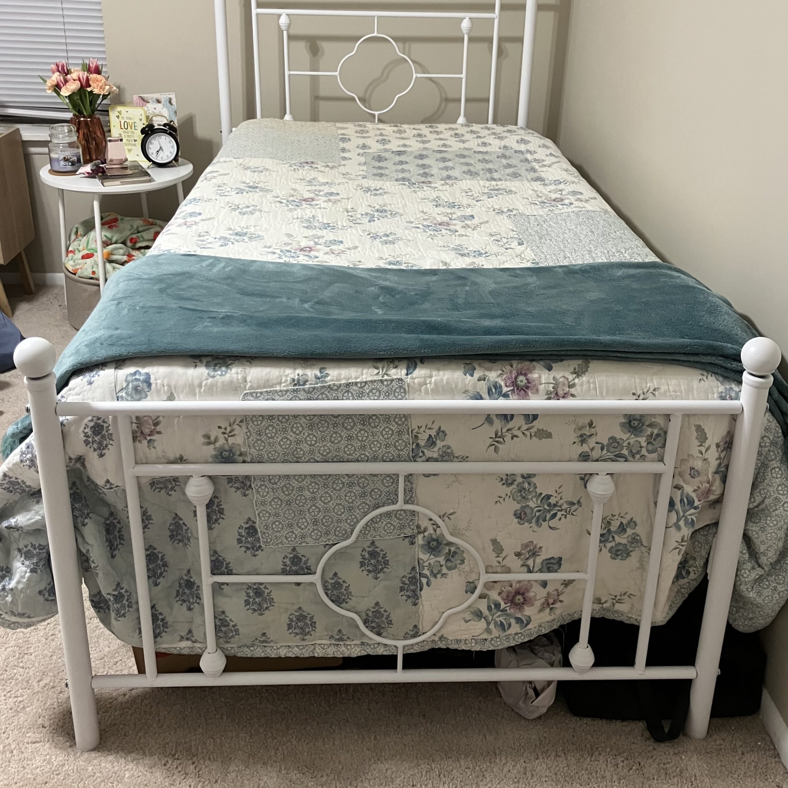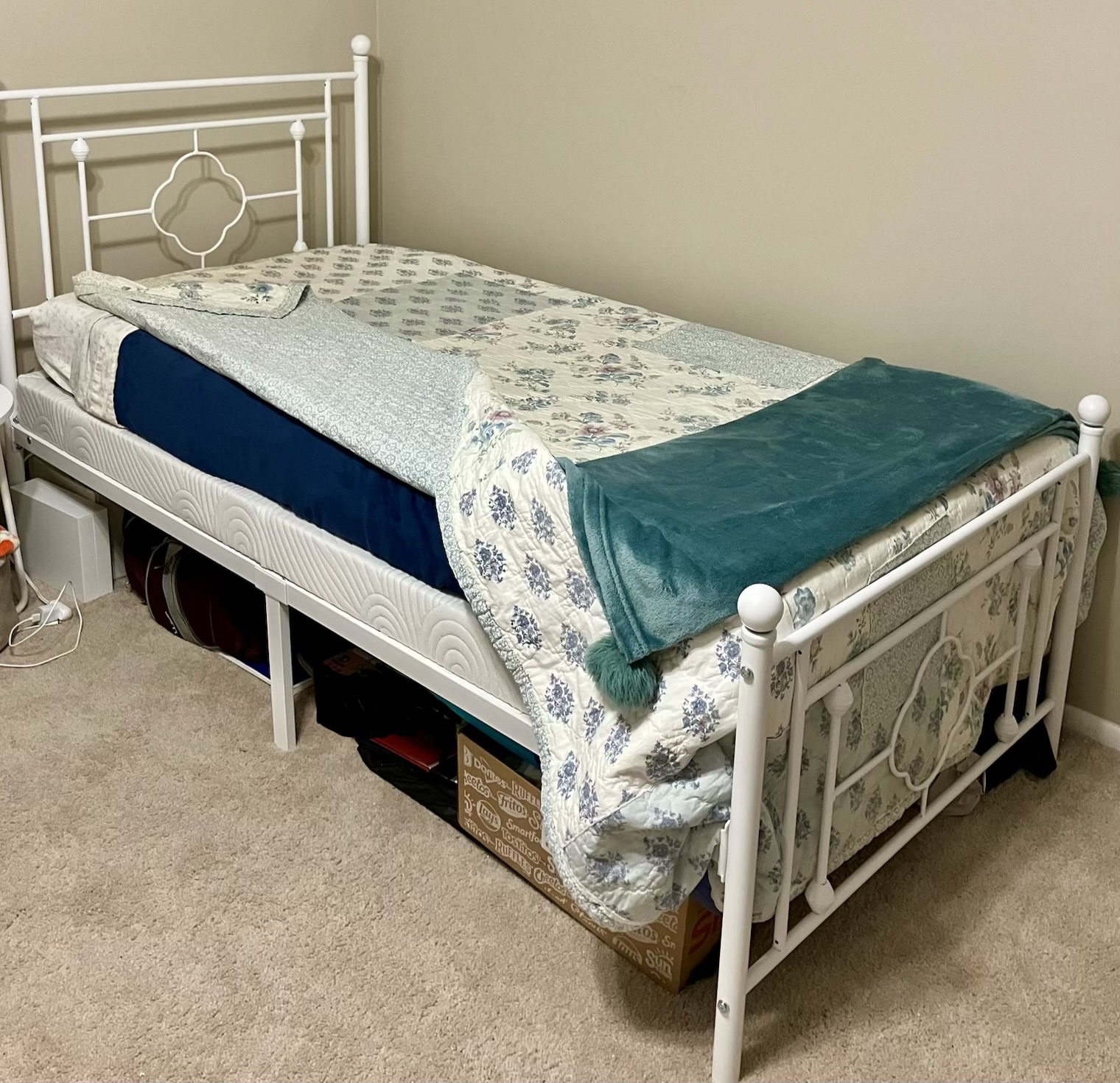 Twin size bed comes with mattress and box spring. They are all less than a year old and in great condition! The bed frame is a white metal frame.